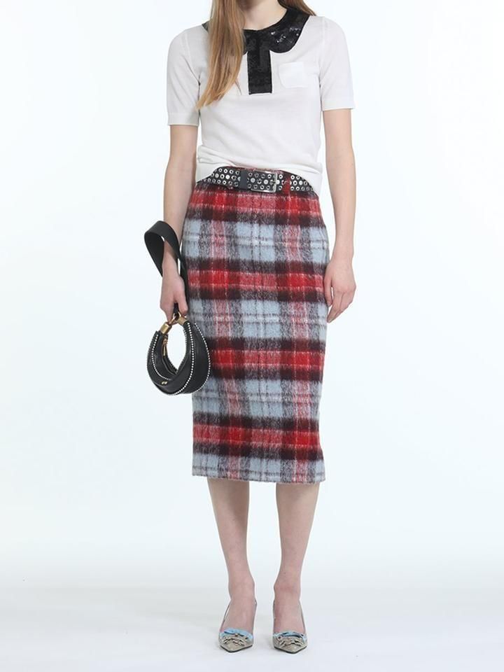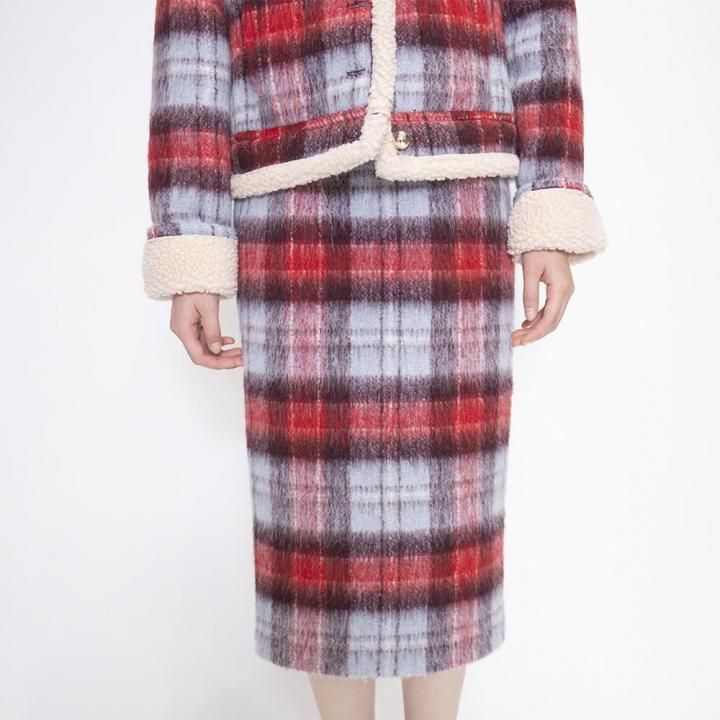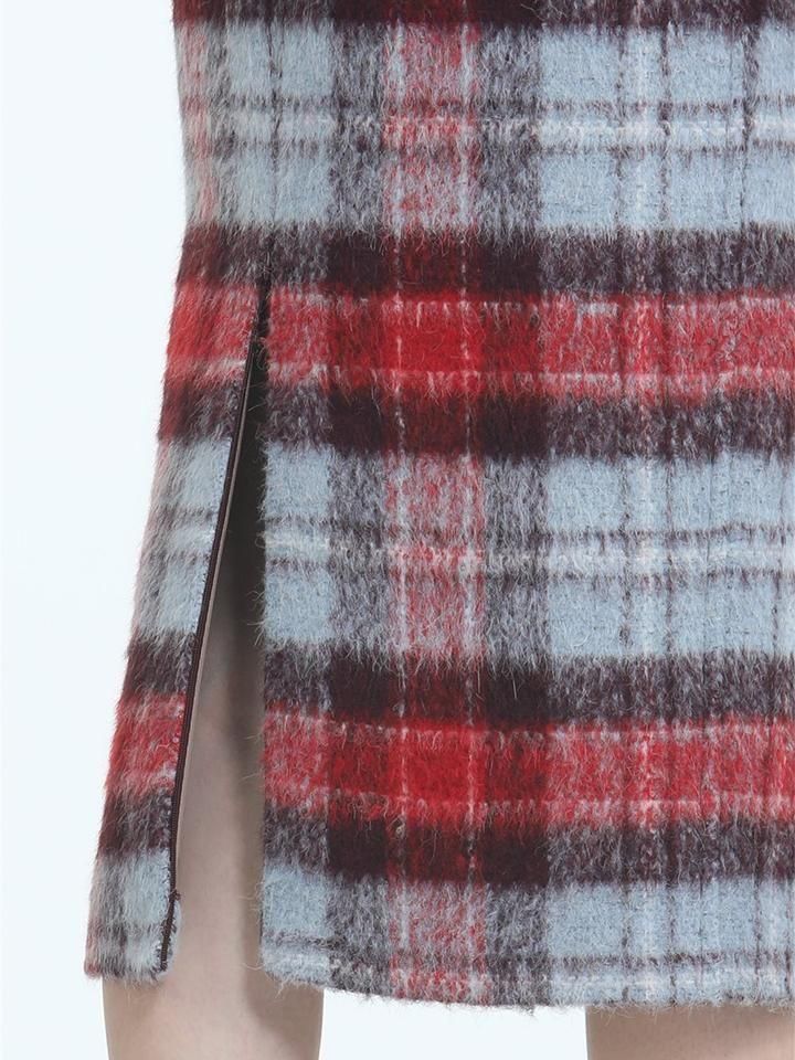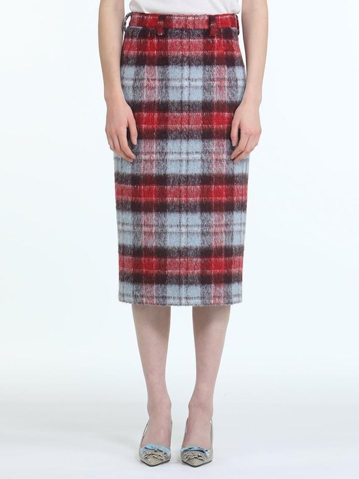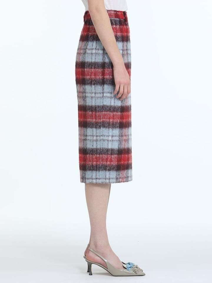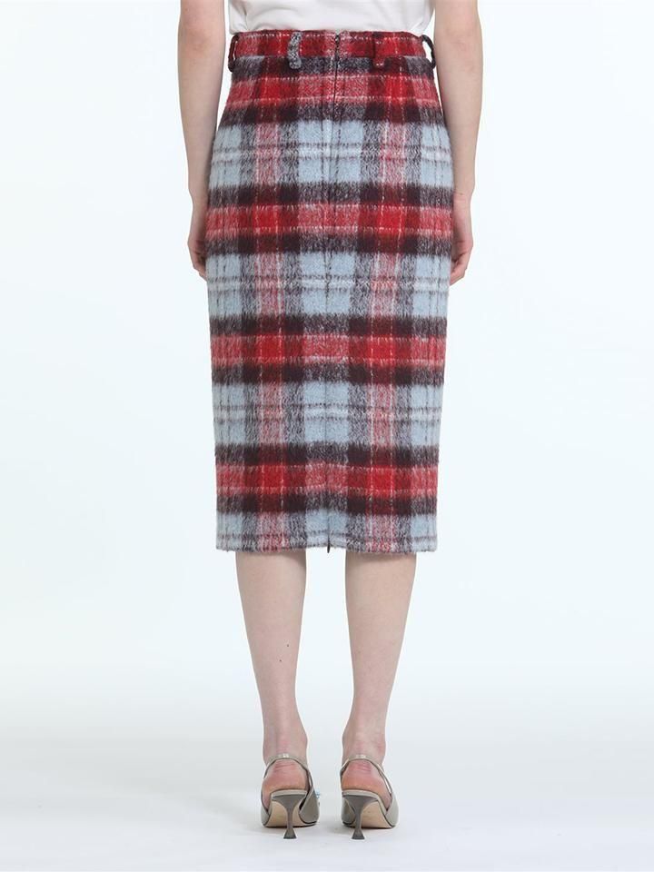 赤・水色・ブラウンのチェック柄が目を引くデザインで、クラシカルな雰囲気の中に遊び心をプラス。膝下丈のタイトなシルエットが、女性らしい美しいラインを演出します。