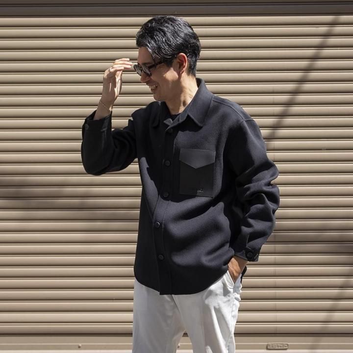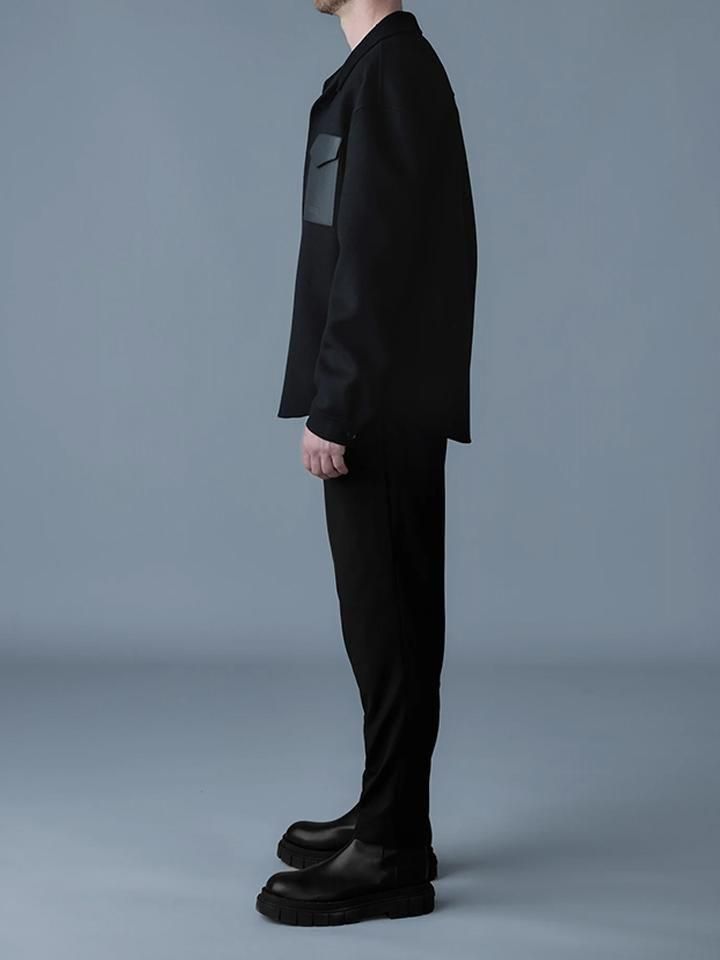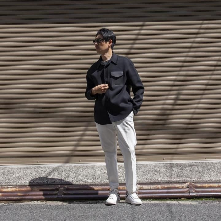 襟はコンバーチブルカラー仕様で、カジュアルからビジネススタイルまで、シーンを選ばず着用できます。胸元にはレザートリムを施したポケットを配置し、シャープで洗練された男らしさを演出。さらに、ポケット部分にはデボス加工によるブランドロゴをさりげなくあしらい、ディテールへのこだわりが光ります。
