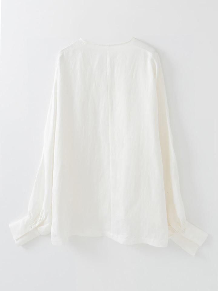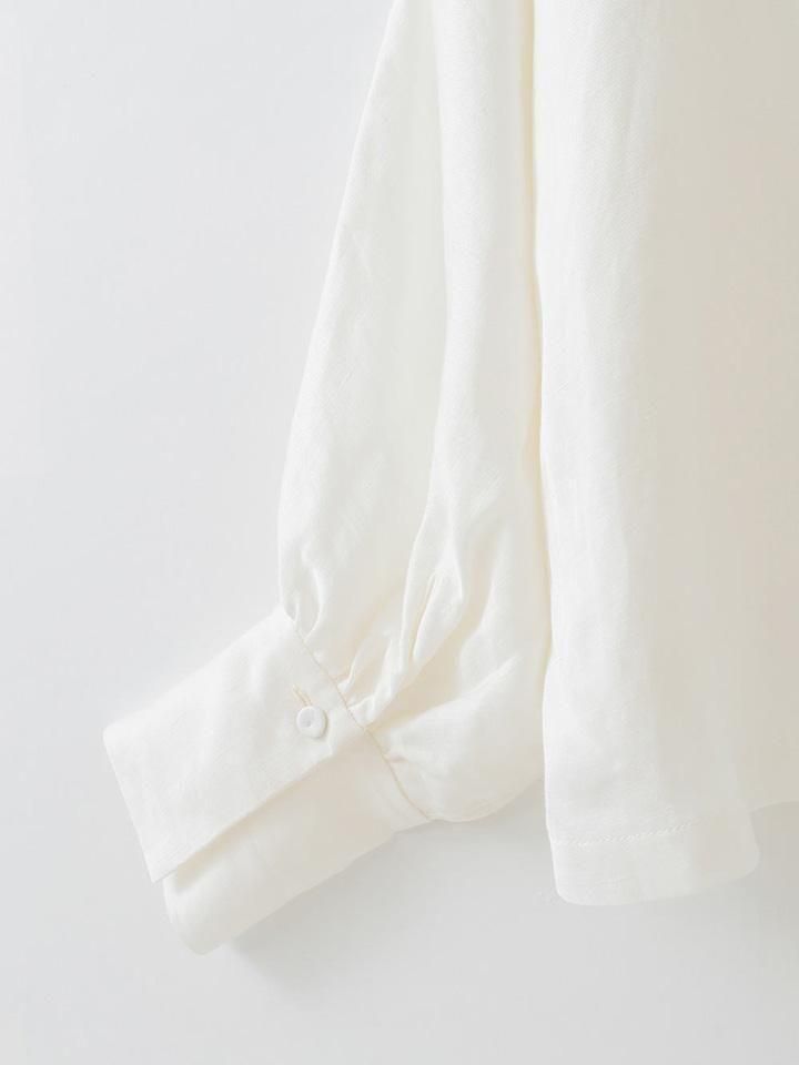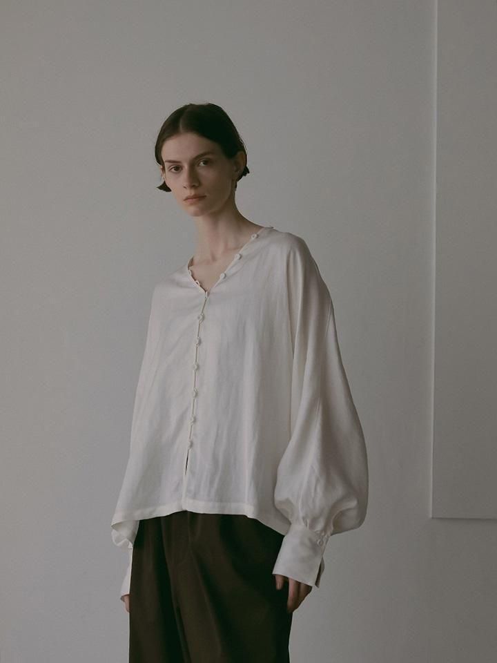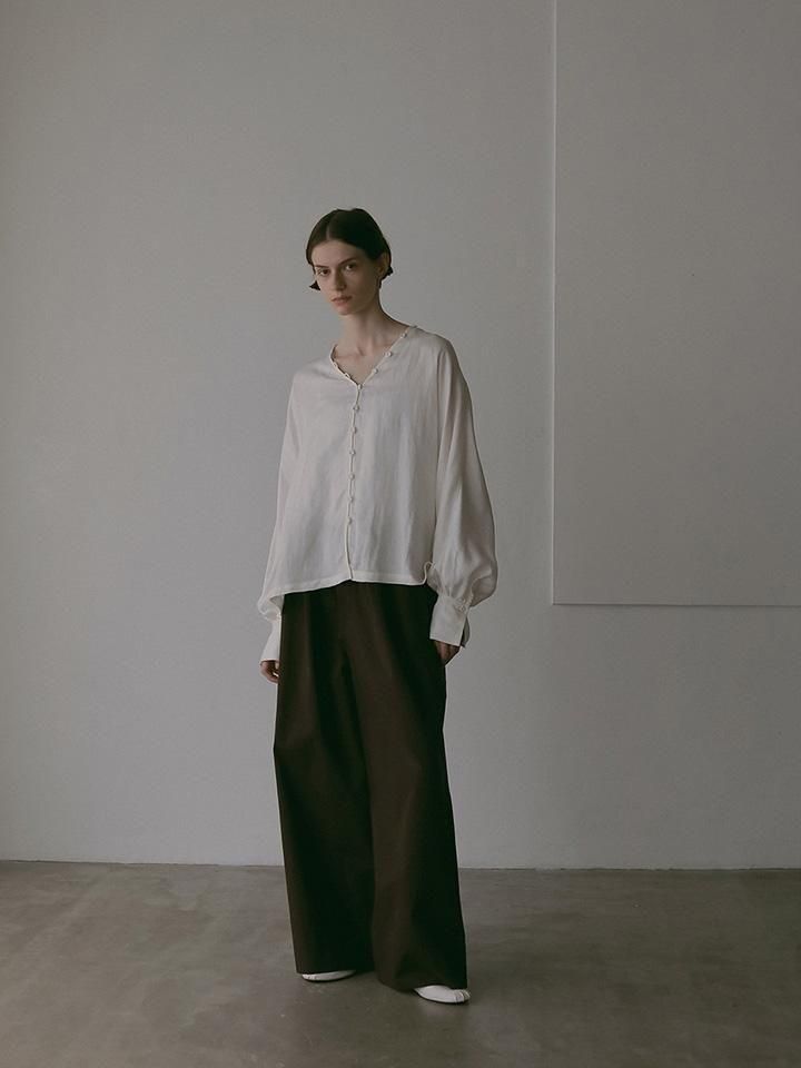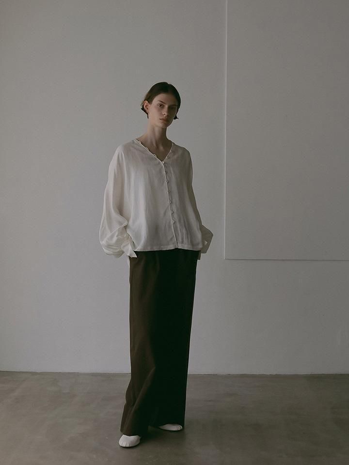 ヴィスコース特有のほどよい光沢と落ち感に、リネンならではのナチュラルな表情とハリ感が加わることで、奥行きのある風合いに仕上がっています。上質な素材感が、シンプルながらも存在感のある一枚。