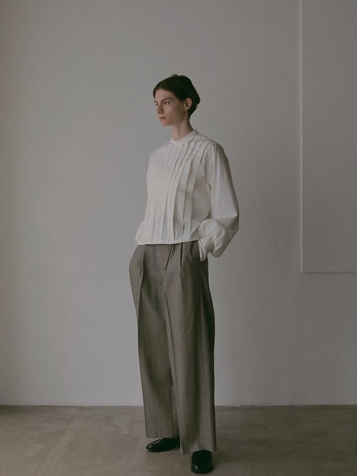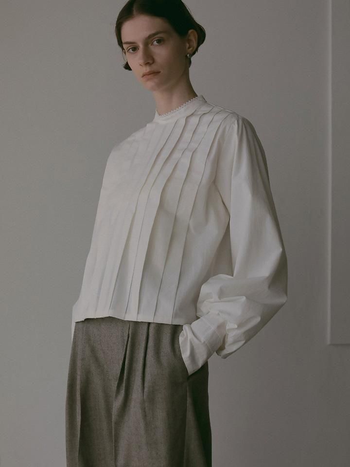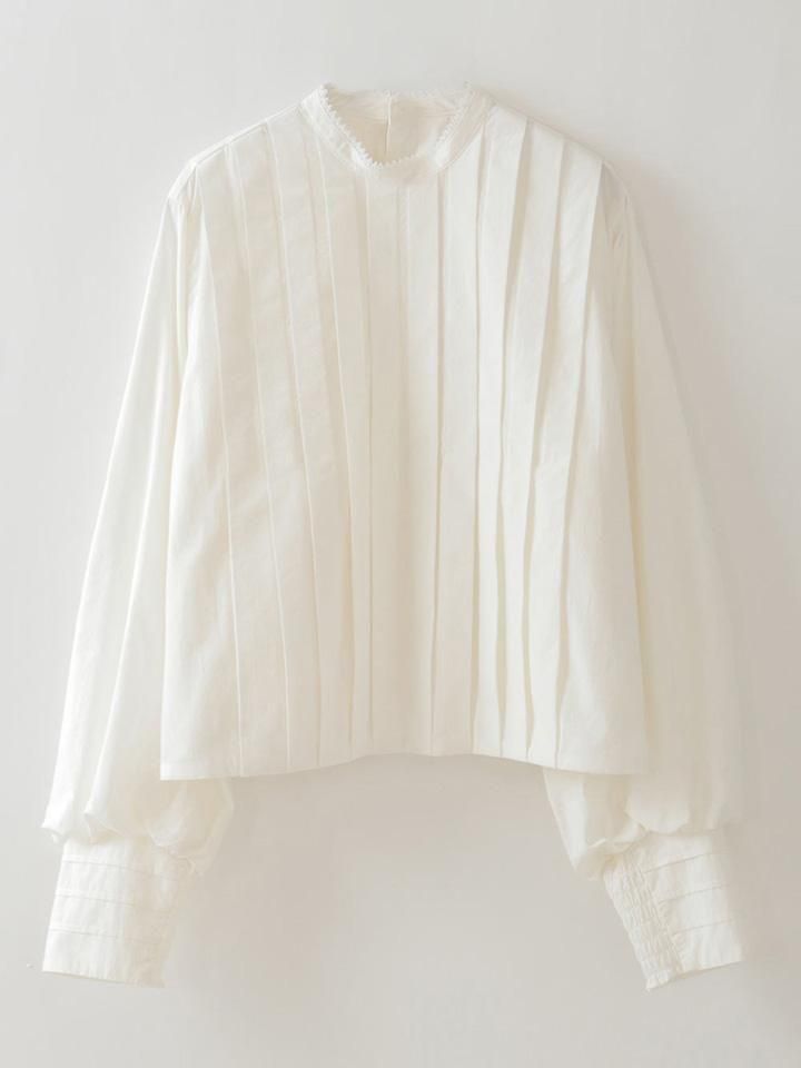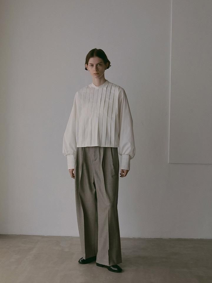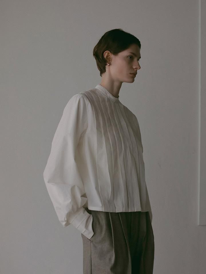 やや短めの着丈に、フロントに幾重にも施されたタックが繊細な印象を演出。立体感のあるフォルムながら、すっきりとしたバランスに整えられており、1枚で着映えするアイテムです。