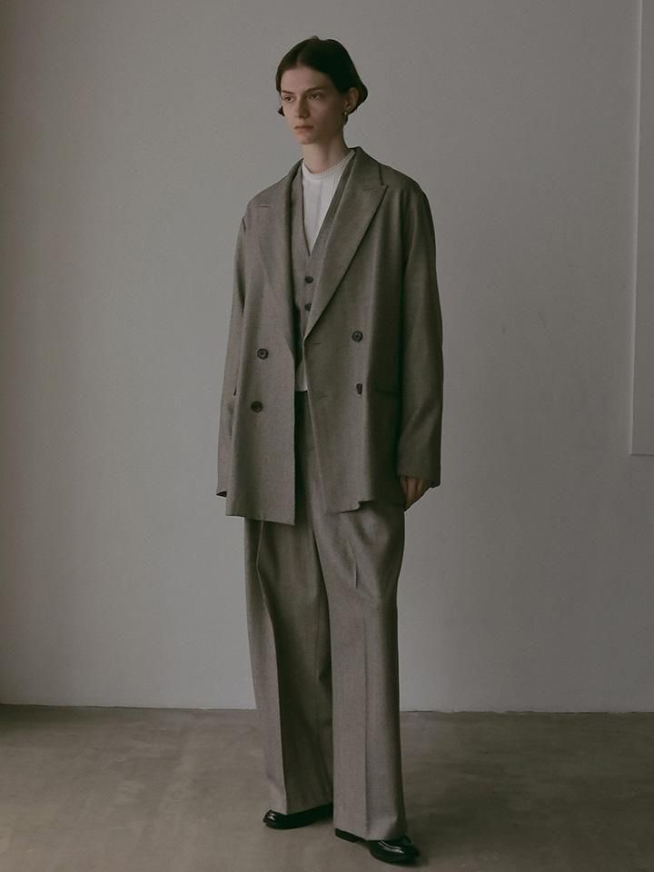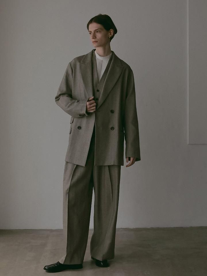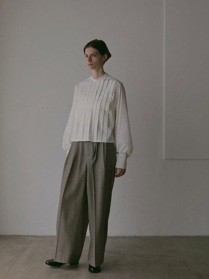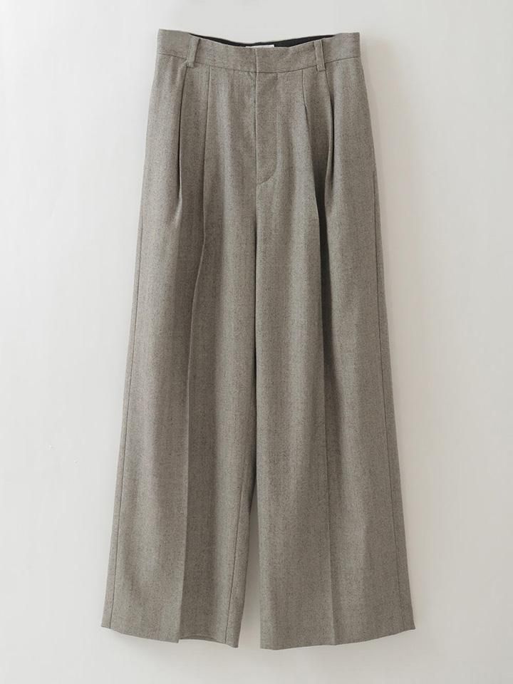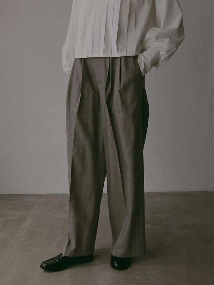 きちんと感と抜け感のバランスが絶妙な、ややワイドなストレートシルエットで、シーンを選ばず着用いただける万能アイテムです。細かなヘリンボーン柄が、さりげないニュアンスを生み出し、無地ライクに使えるのも嬉しいポイント。ミニマルなトップスと合わせてもどこか奥行きのある印象に仕上がります。