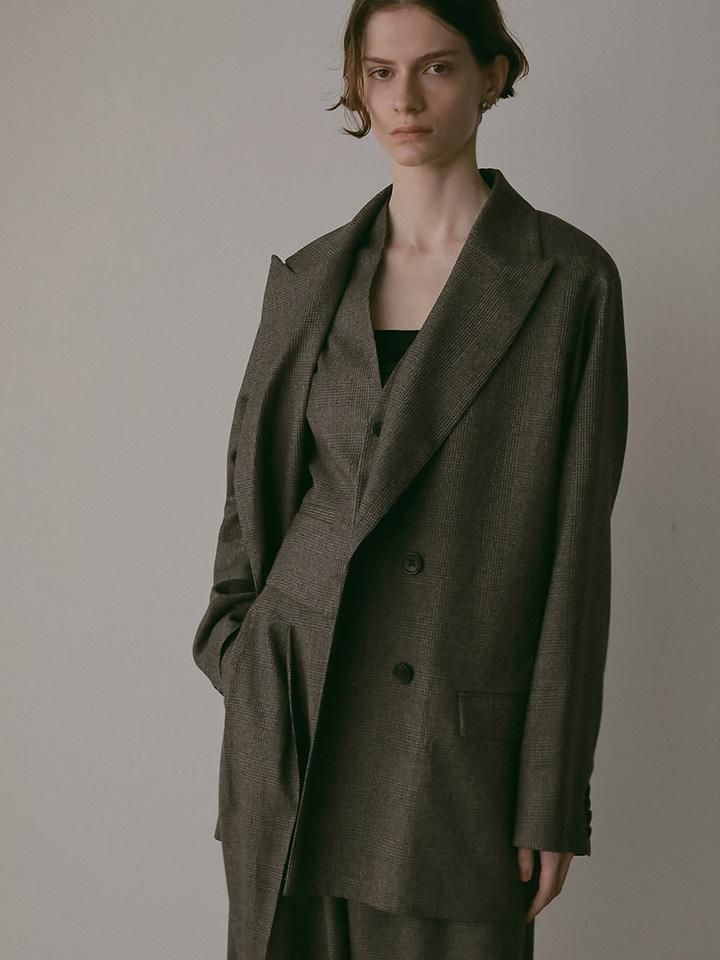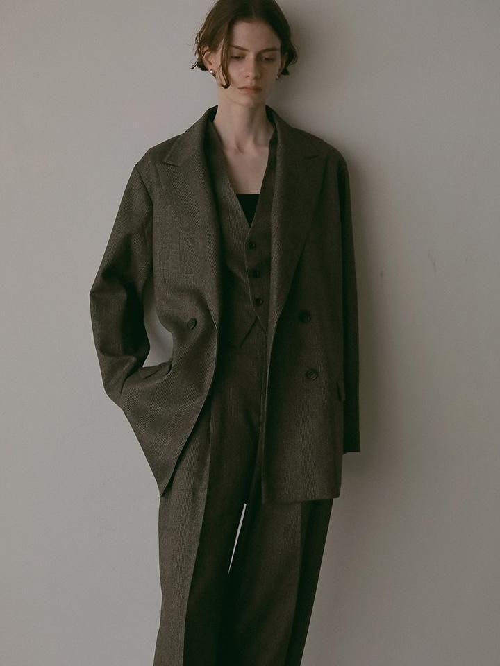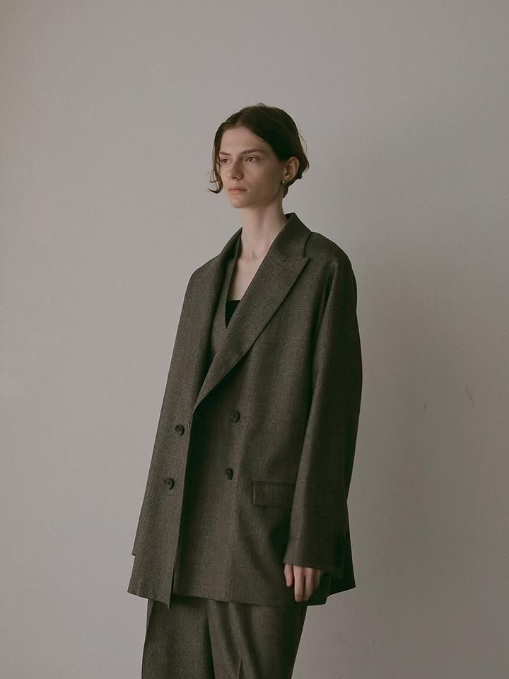 先染めのサキソニー素材に秋らしいチェック柄をのせた、ダブルブレストのジャケット。