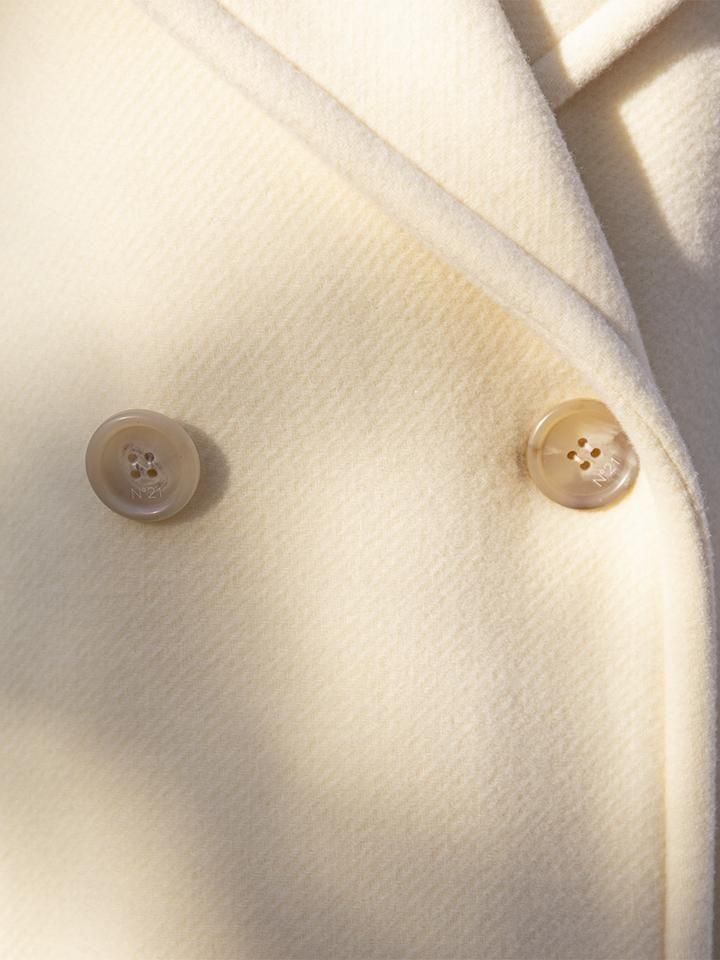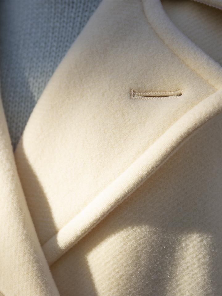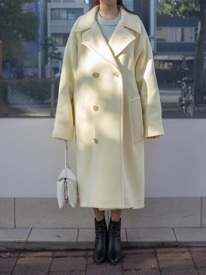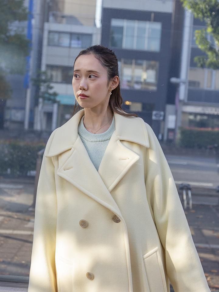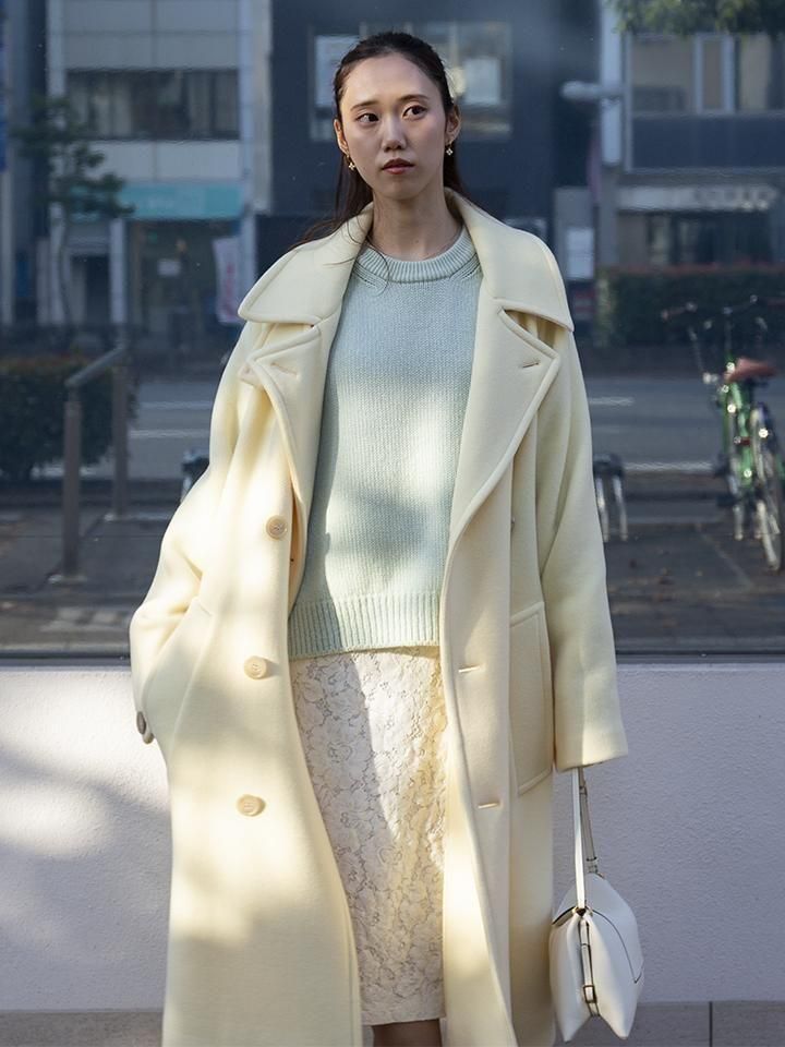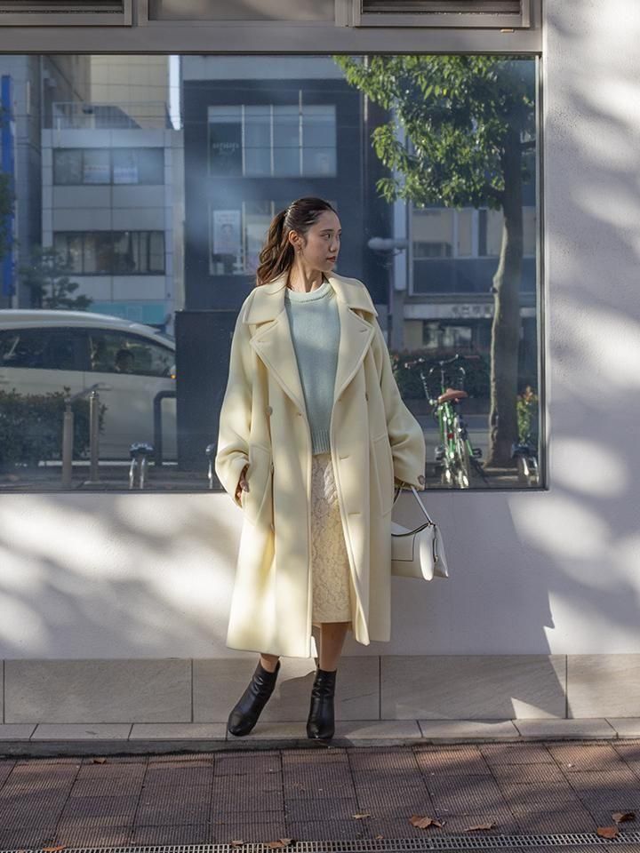 淡いニュアンスカラーとクラシカルなディテールが調和した、秋冬のスタイリングに映える一着です。