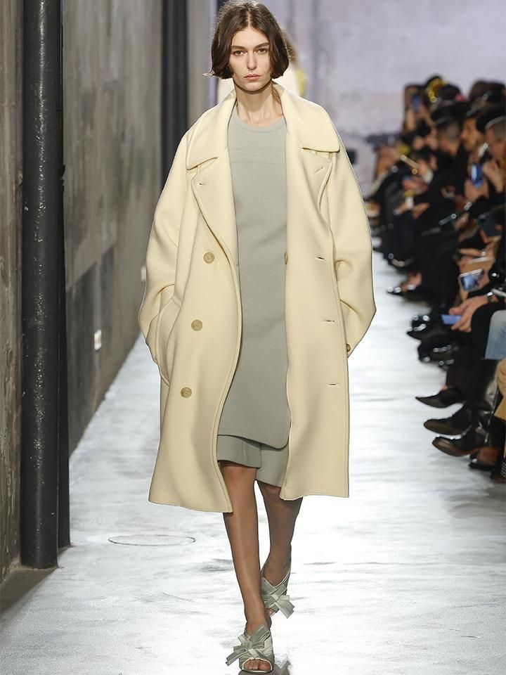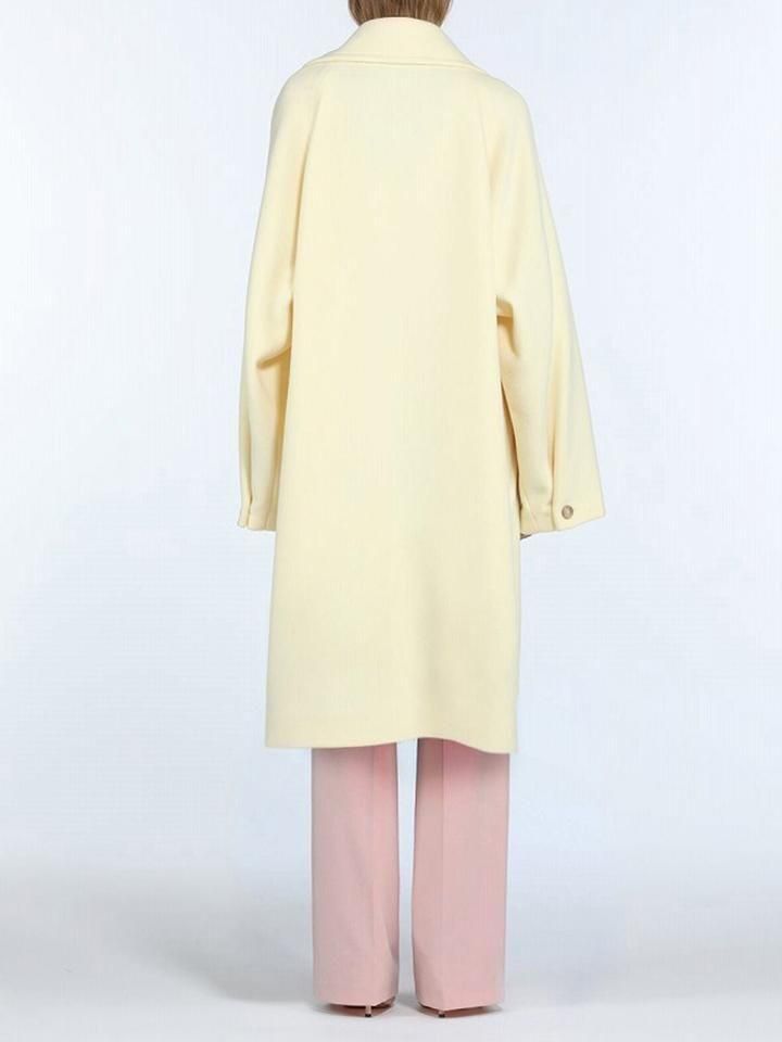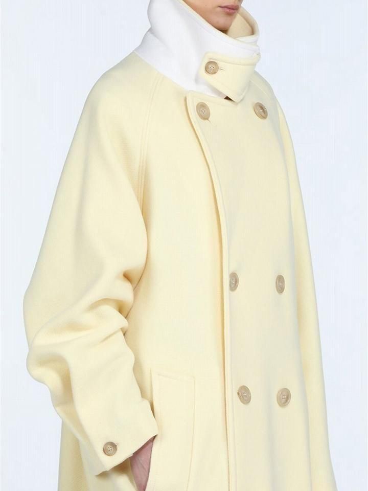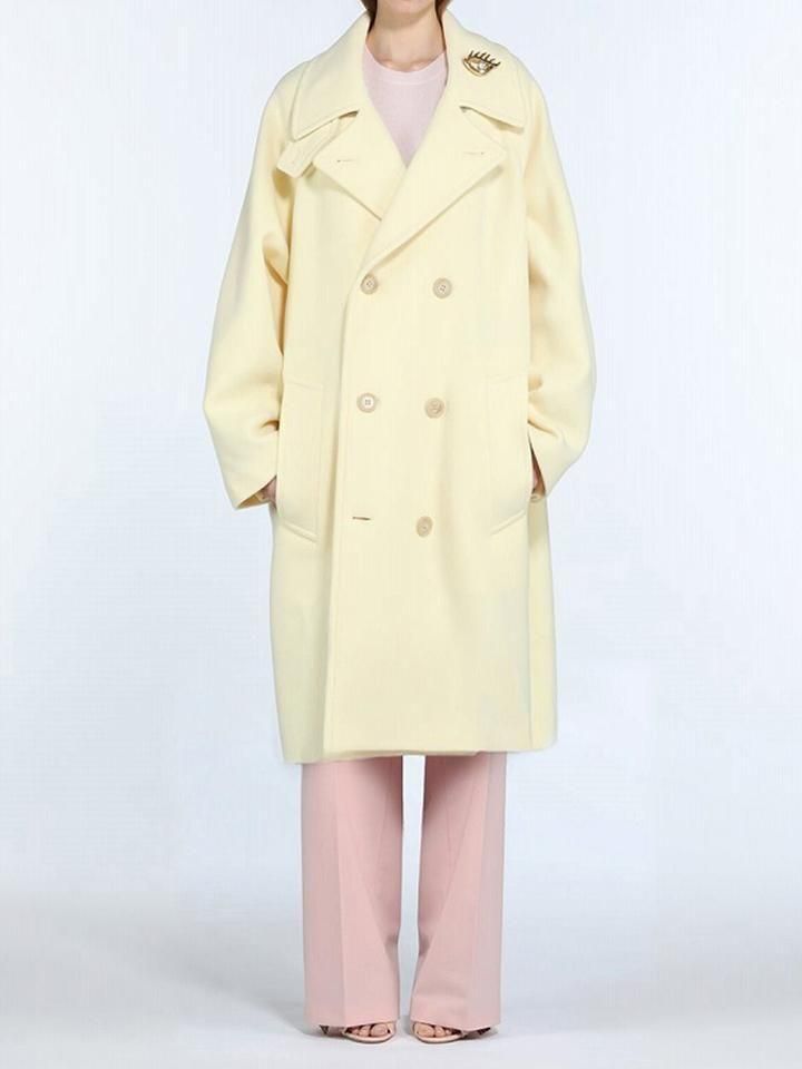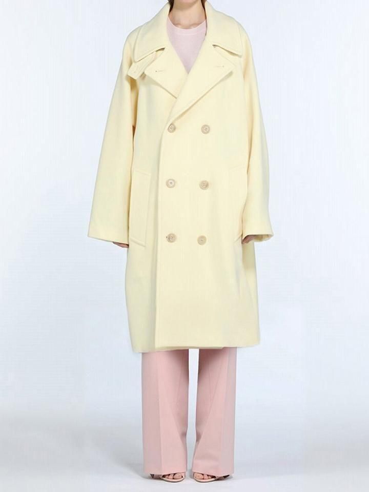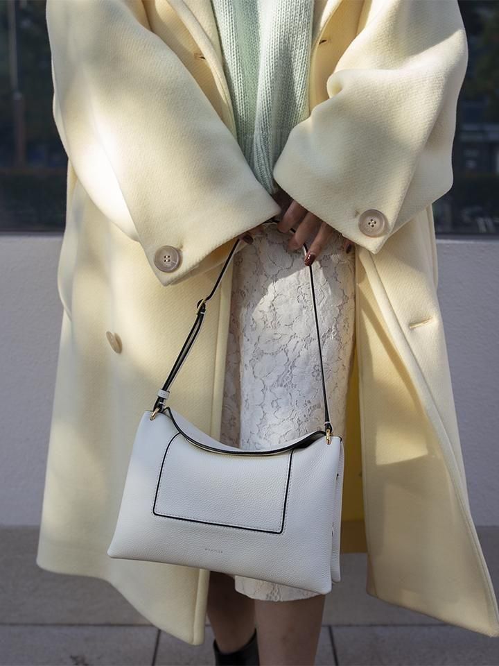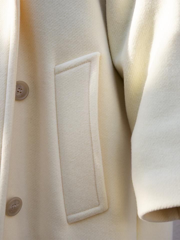 淡いニュアンスカラーとクラシカルなディテールが調和した、秋冬のスタイリングに映える一着です。